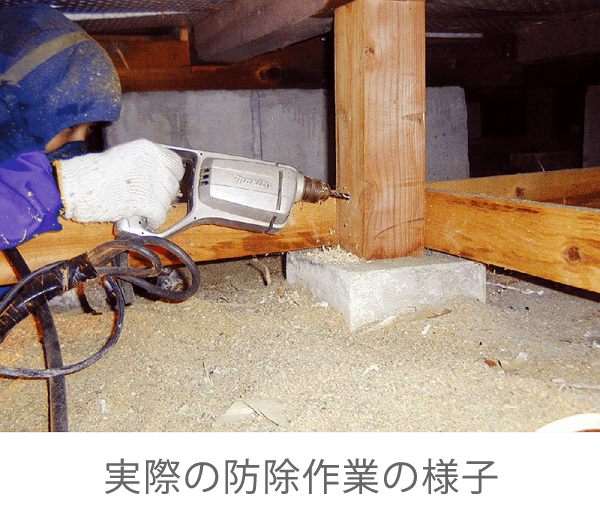 (社)日本しろあり対策協会が定める仕様に準じた防除方法で、建物の強度に影響を与えず、家のすみずみまで丁寧に行います。